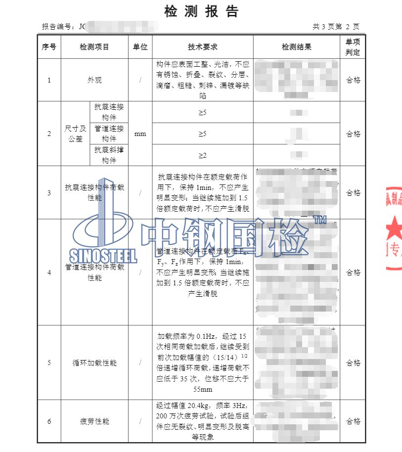 檢測項目:1.外觀,2.尺寸及公差,3.抗震連接構件荷載性能,4.管道連接構件荷載性能,5.循環加載性能,6.疲勞性能,7.鍍鋅層厚度,8.防腐性能,9.耐火性能。