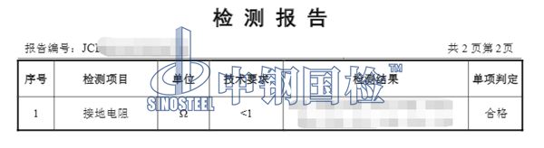 中鋼國(guó)檢擁有符合標(biāo)準(zhǔn)要求的專業(yè)實(shí)驗(yàn)室,可以保證檢測(cè)數(shù)據(jù)的準(zhǔn)確性。中鋼國(guó)檢的服務(wù)群體已經(jīng)覆蓋全國(guó),目前有十多家分公司和34個(gè)辦事處在全國(guó)各地分布,能做的及時(shí)響應(yīng),及時(shí)出具報(bào)告,并具有CMA/CNAS檢測(cè)資質(zhì),檢測(cè)報(bào)告全國(guó)認(rèn)可。下面是某單位委托中鋼國(guó)檢做的接地電阻檢測(cè),詳細(xì)內(nèi)容如下: