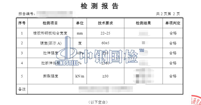 檢測項目:1.橡膠和鋼板粘合寬度,2.硬度(邵爾 A),3.拉伸強度,4.拉斷伸長率,5.撕裂強度。