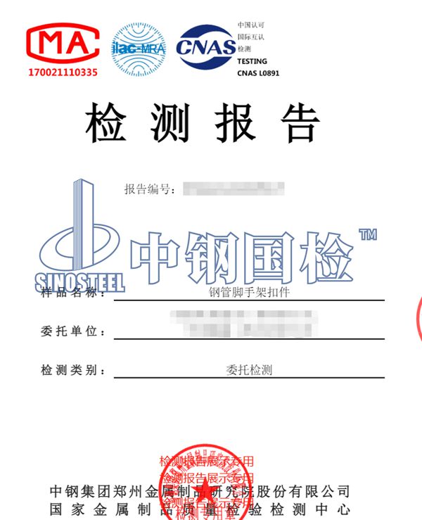 中鋼國檢擁有符合標準要求的專業實驗室,可以保證檢測數據的準確性。中鋼國檢的服務群體已經覆蓋全國,目前有十多家分公司和34個辦事處在全國各地分布,能做的及時響應,及時出具報告,并具有CMA/CNAS檢測資質,檢測報告全國認可。下面是部分委托中鋼國檢做的腳手架扣件檢測,詳細內容如下: