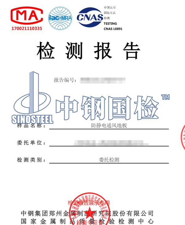 中鋼國檢檢測案例下面是某單位委托我司檢測的防靜電通風(fēng)地板,客戶要求檢測有七個項(xiàng)目,我們檢測后出具檢測報告。