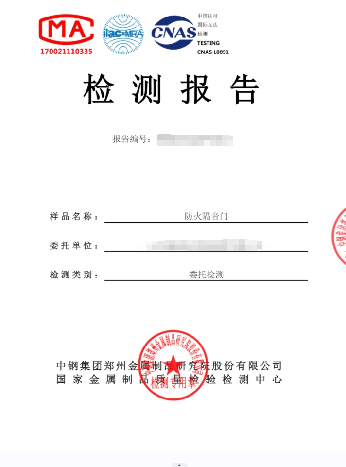 防火隔音門檢測報告哪家檢測公司能辦理?我們是在中鋼國檢做的檢測,出具的CMA、CNAS、ILAC檢測報告,檢測了耐火性能,檢測周期還是比較短的,7天就拿到了檢測報告,相比較其他檢測公司檢測時間快得很。